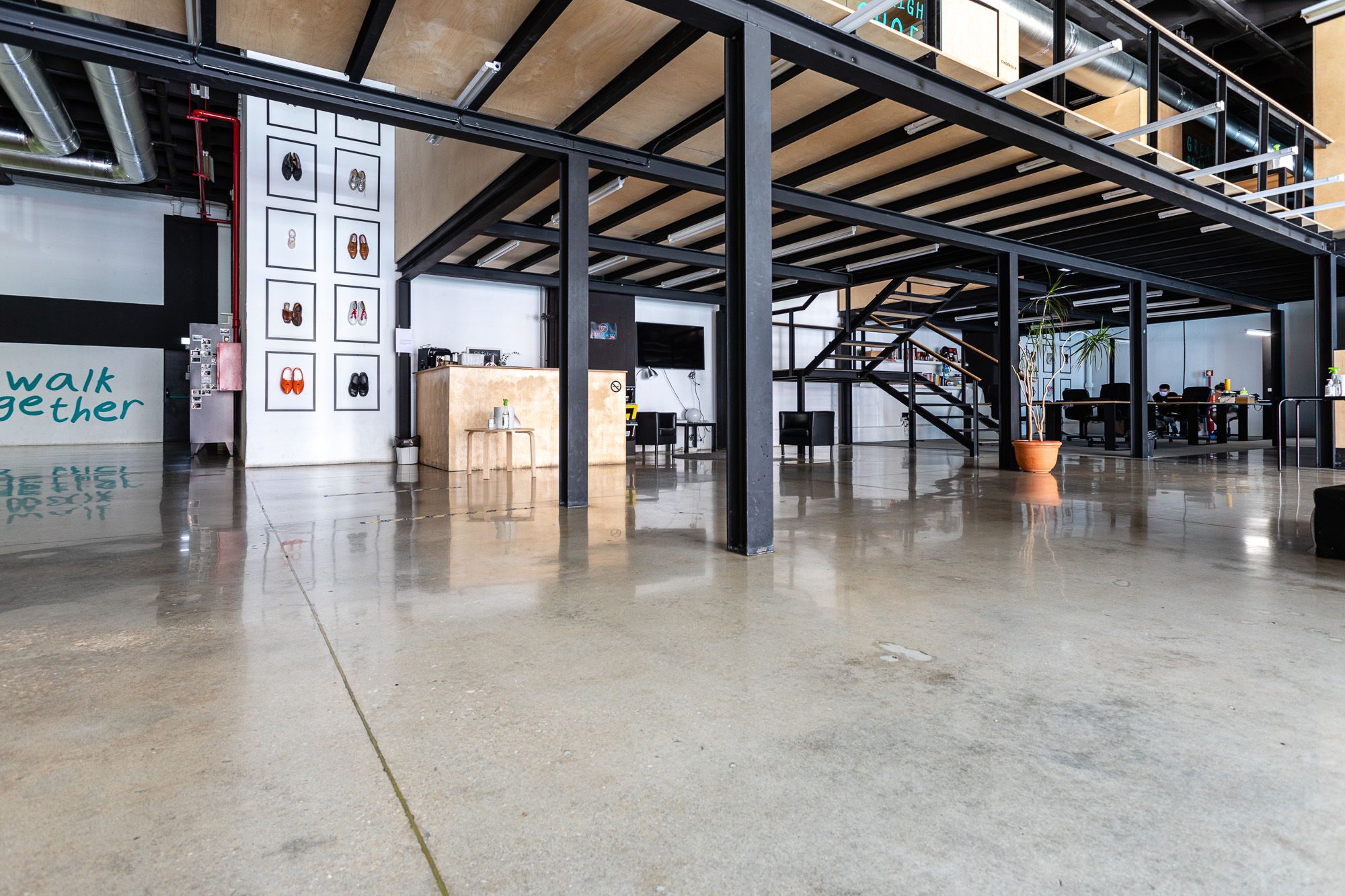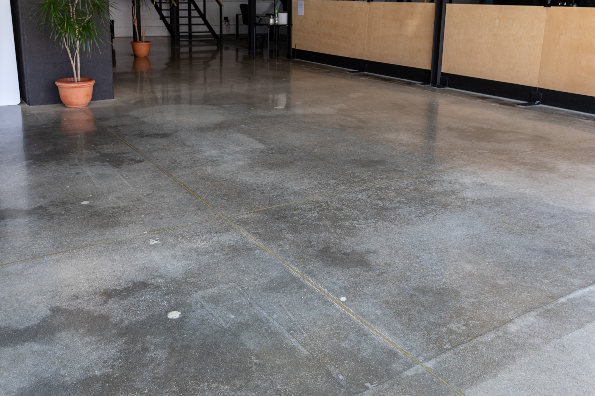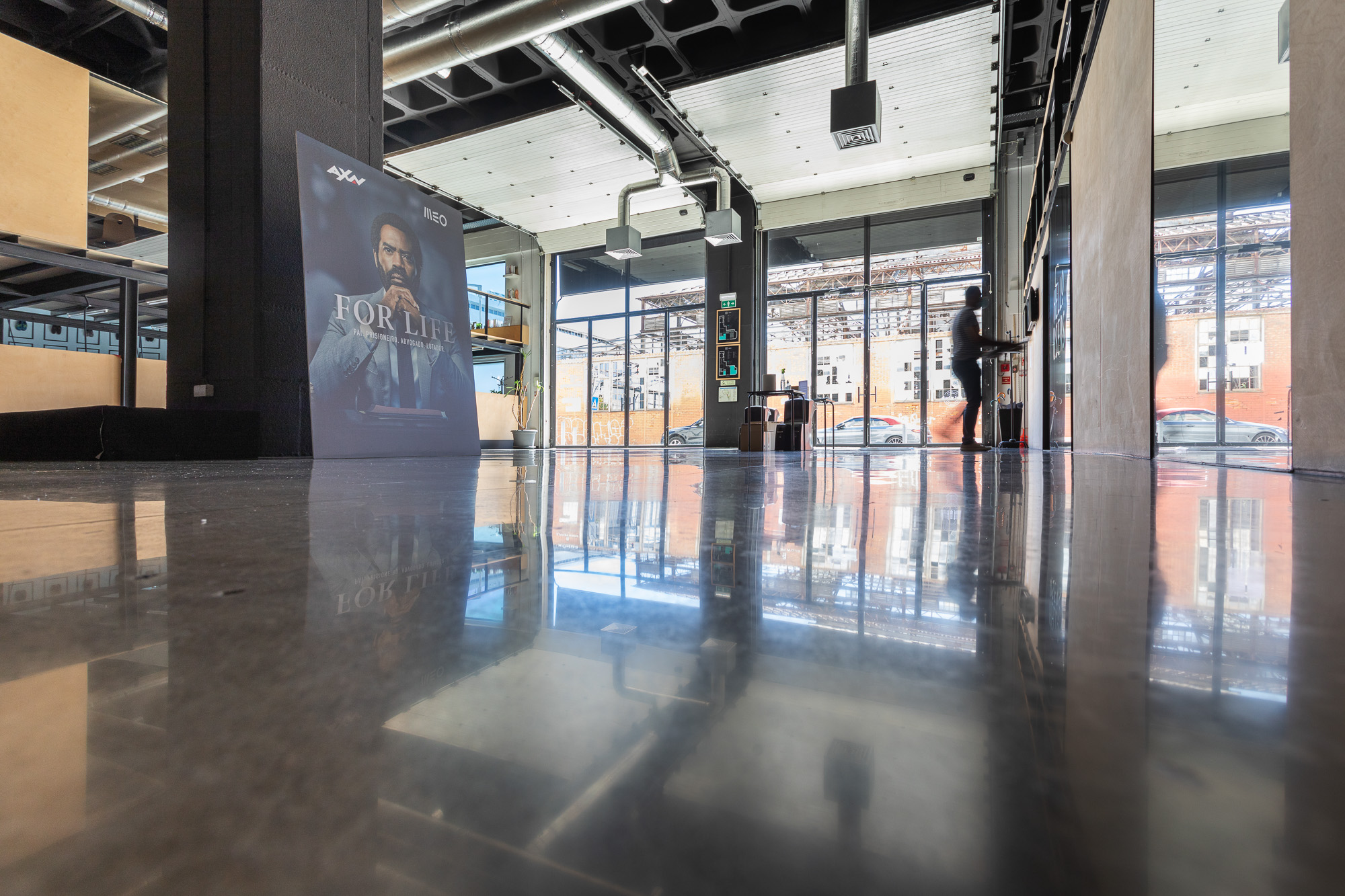 Renovação de antigo armazém com pavimento térreo em betão industrial, muito velho e usado durante décadas. Convertido num escritório de alto padrão em open space, contemplando desbaste inicial com ferramentas metálicas grão 30, densificação com RetroPlate, seguido de processo de polimento até grão 1500, e selagem com RetroGuard. Enchimento das juntas com resina de poliureia da Curecrete Inc.