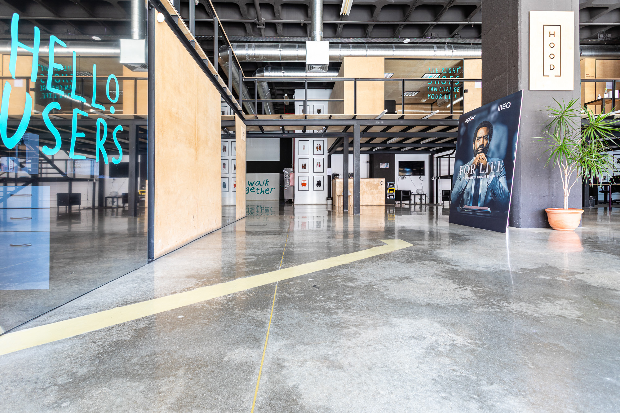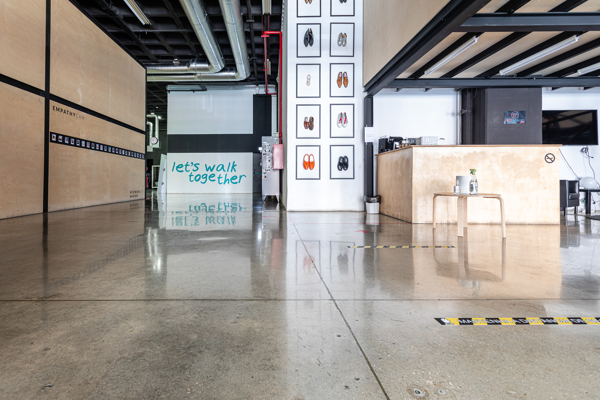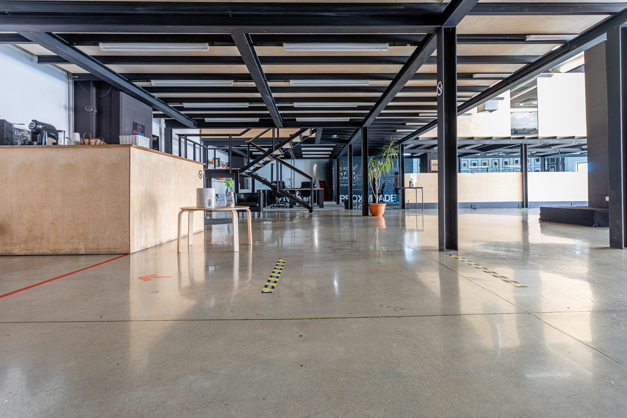 Renovação de antigo armazém com pavimento térreo em betão industrial, muito velho e usado durante décadas. Convertido num escritório de alto padrão em open space, contemplando desbaste inicial com ferramentas metálicas grão 30, densificação com RetroPlate, seguido de processo de polimento até grão 1500, e selagem com RetroGuard. Enchimento das juntas com resina de poliureia da Curecrete Inc.