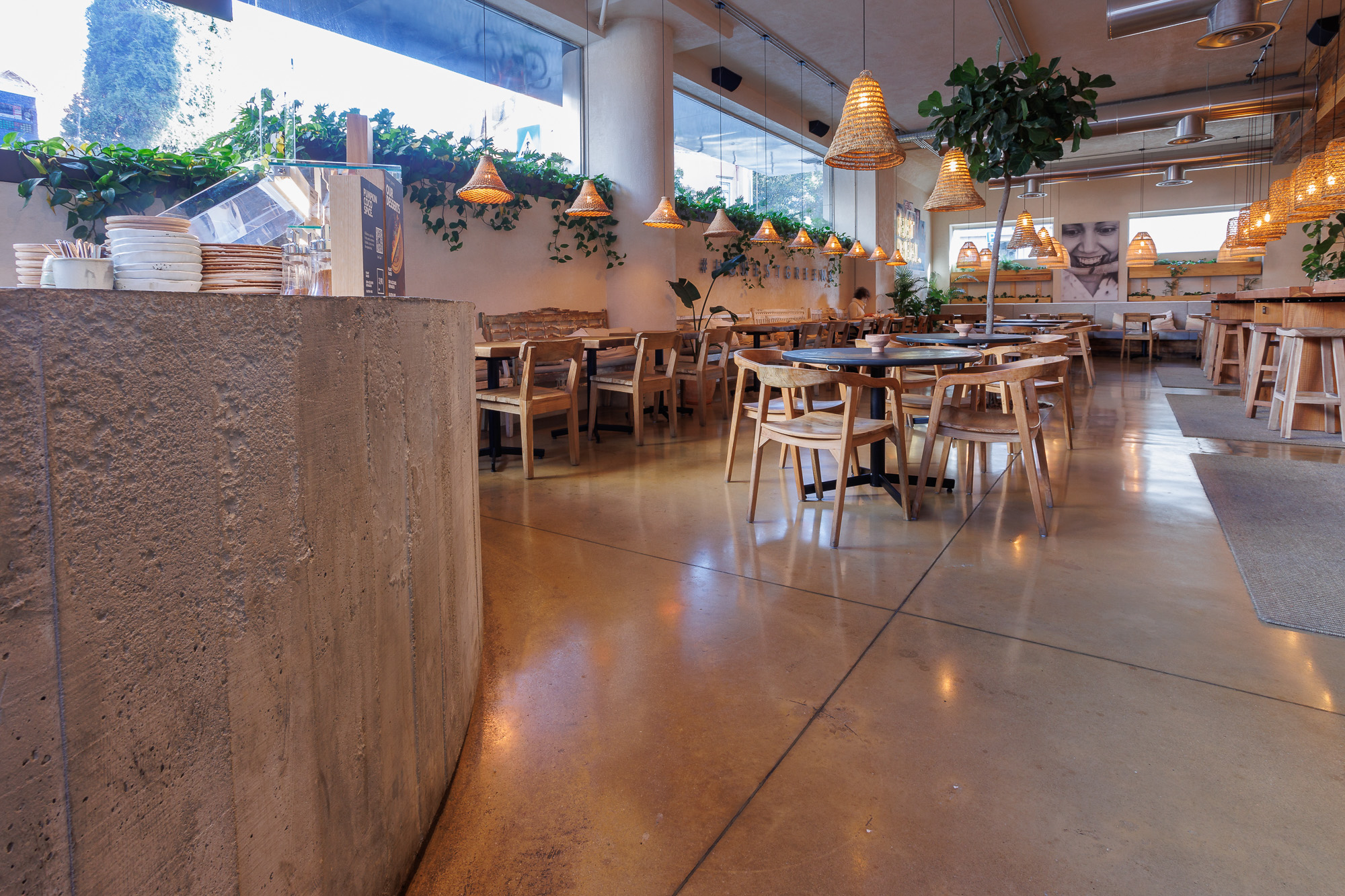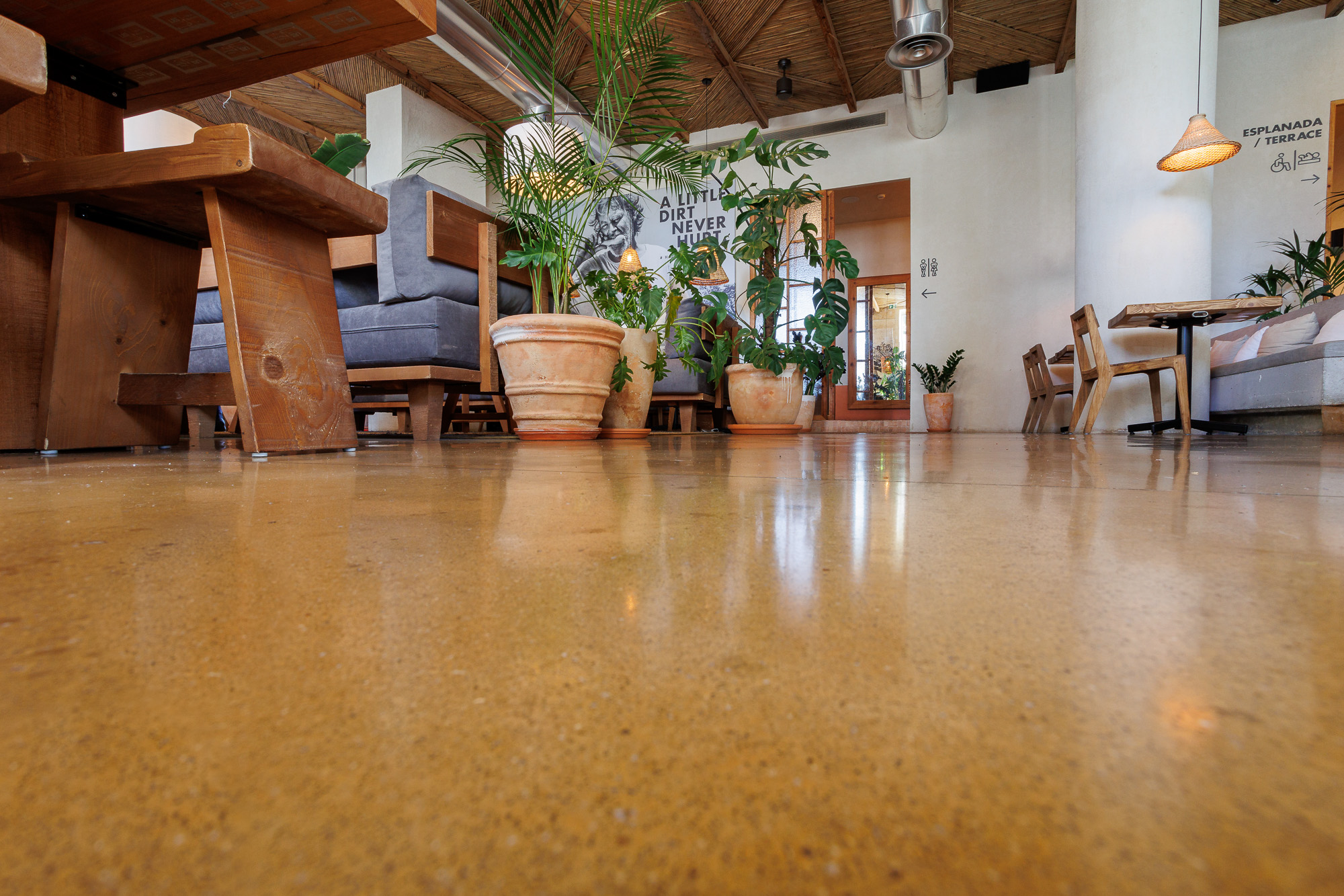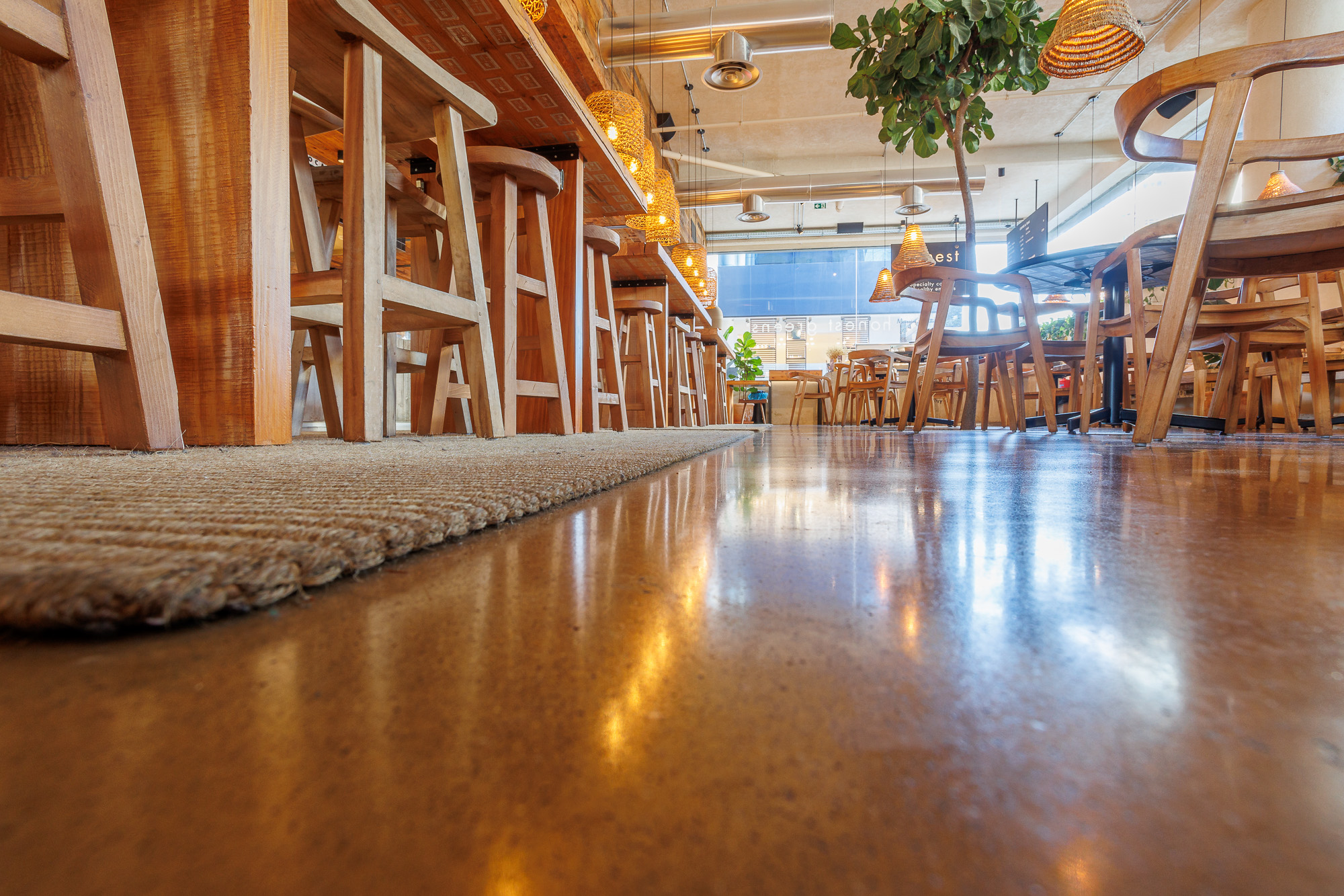 O trabalho sobre o pavimento do restaurante Honest Greens (Amoreiras), começou com a lixagem do pavimento com ferramentas metálicas grão 70 e 120, por forma a colocar à vista os pequenos inertes do endurecedor dourado utilizado no betão novo. Densificação com Ashford Formula, polimento com ferramentas fenólicas até grão 800 e selagem com RetroGuard.