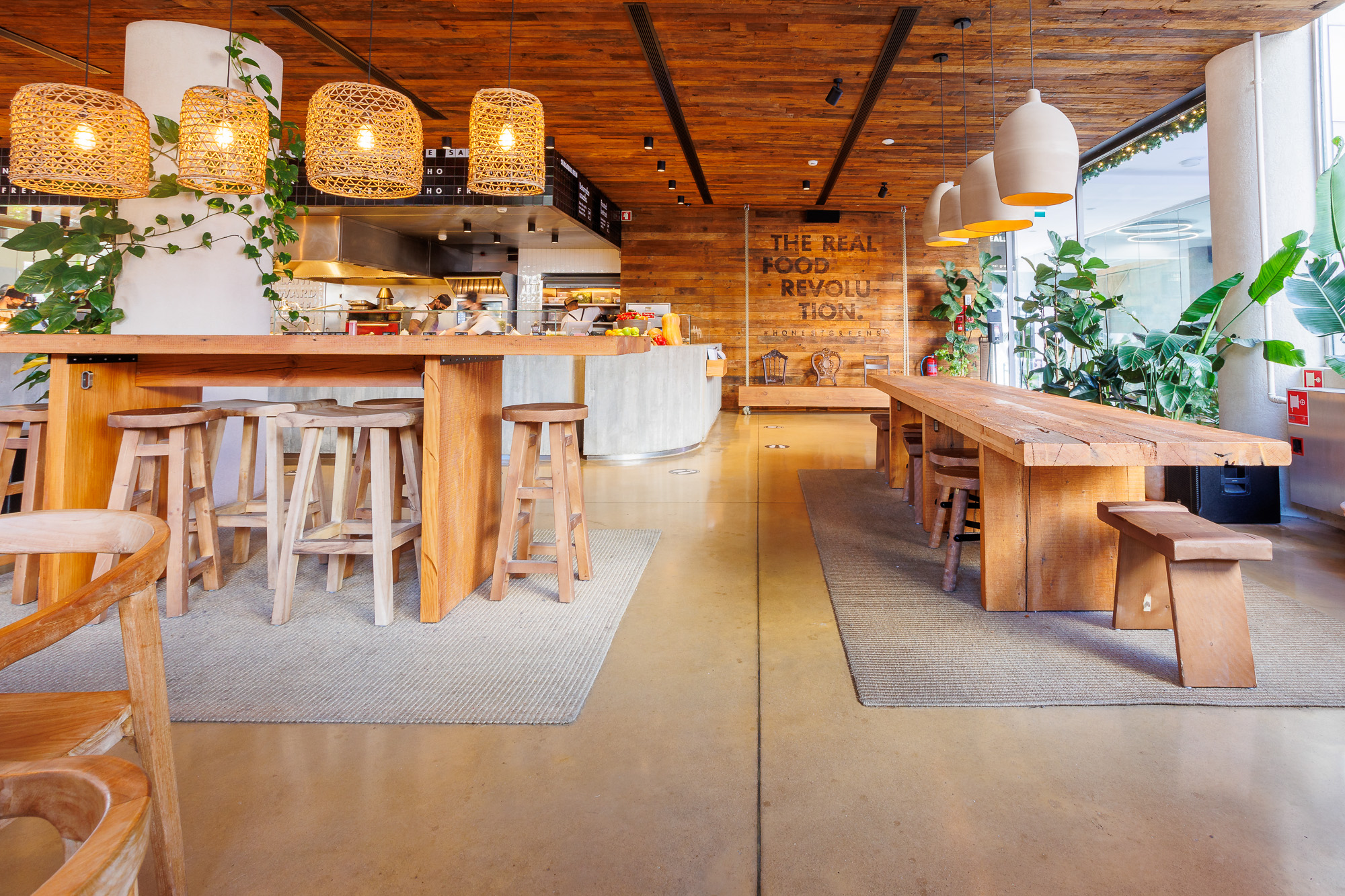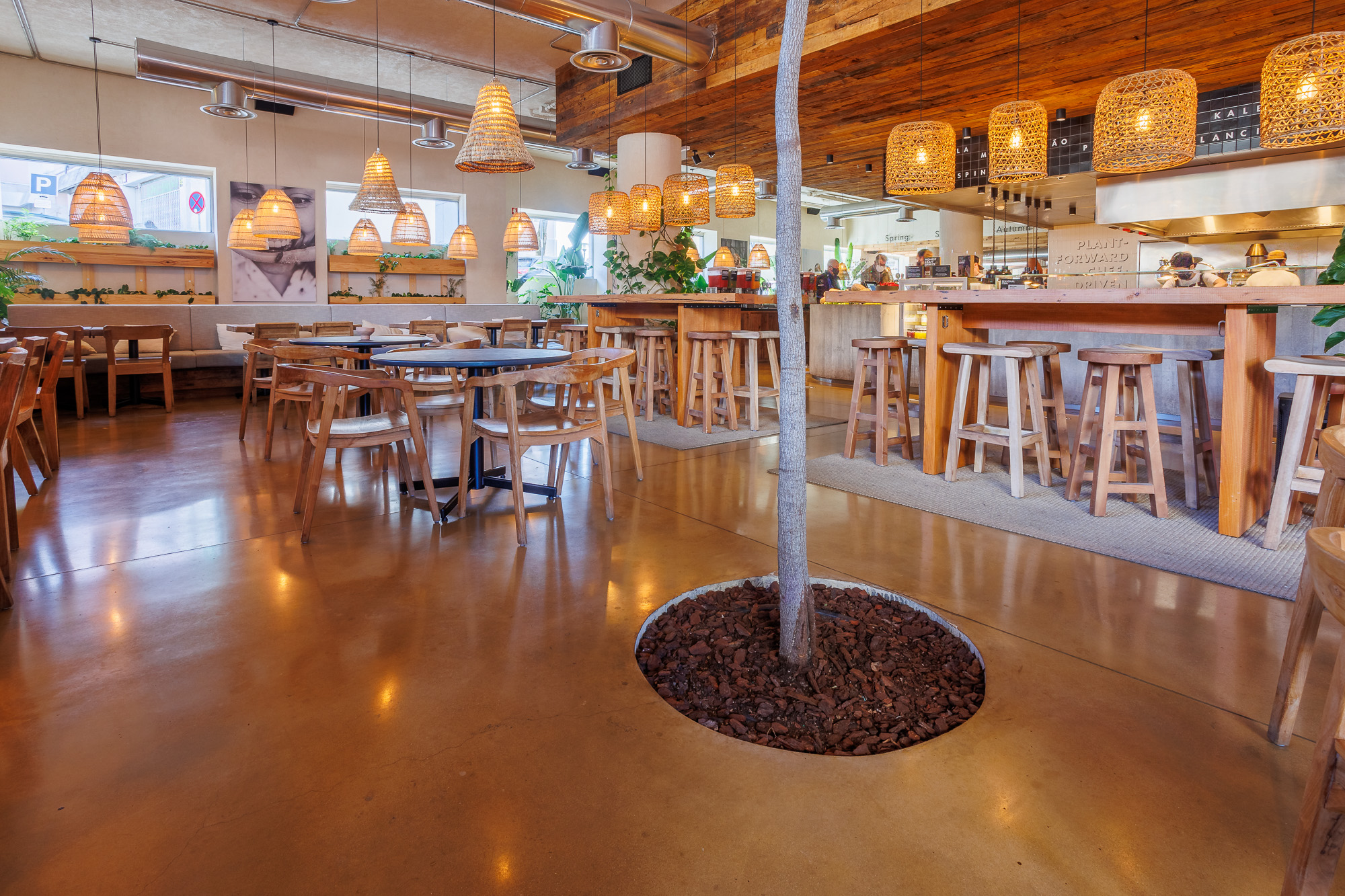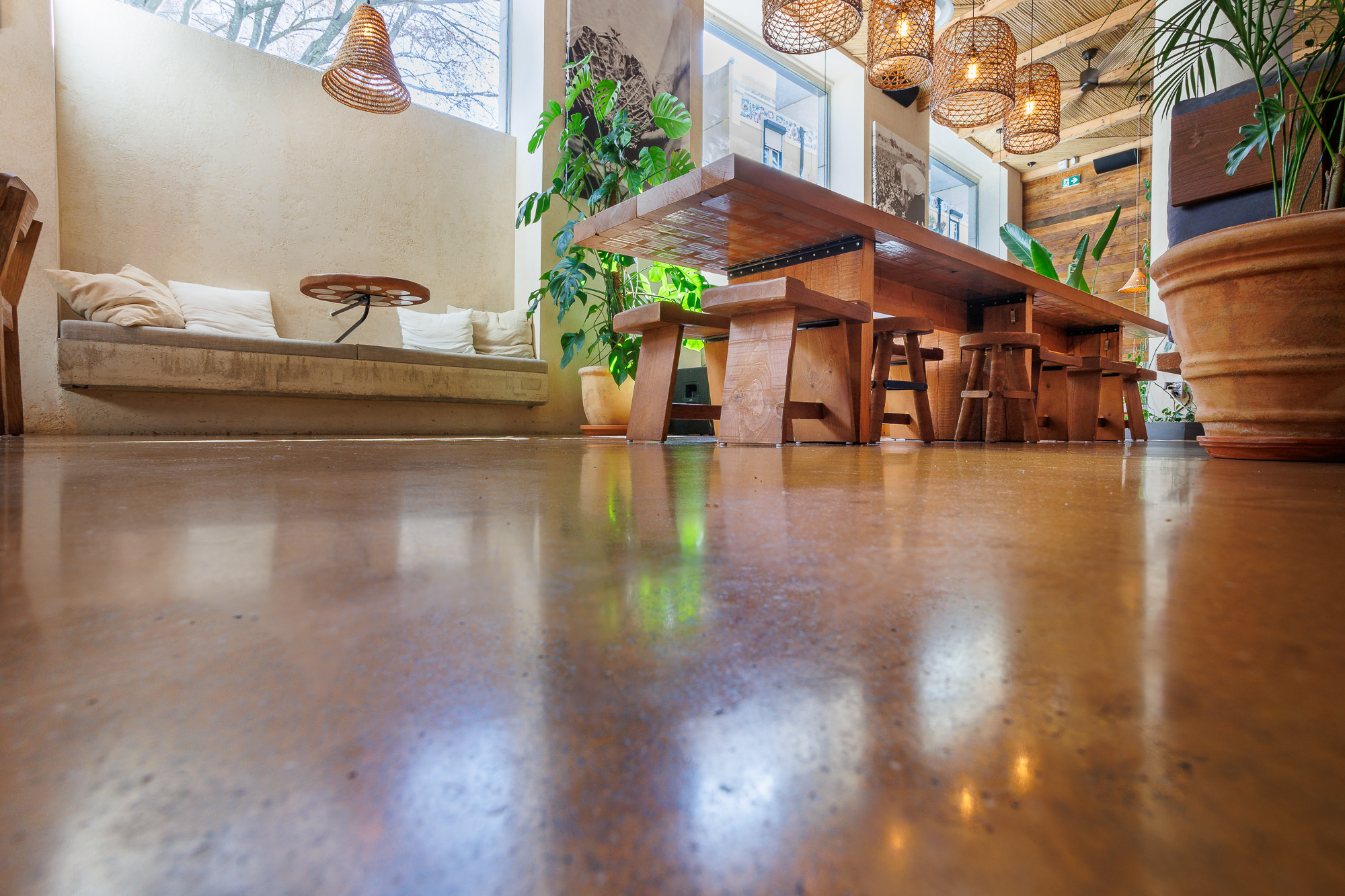 O trabalho sobre o pavimento do restaurante Honest Greens (Amoreiras), começou com a lixagem do pavimento com ferramentas metálicas grão 70 e 120, por forma a colocar à vista os pequenos inertes do endurecedor dourado utilizado no betão novo. Densificação com Ashford Formula, polimento com ferramentas fenólicas até grão 800 e selagem com RetroGuard.