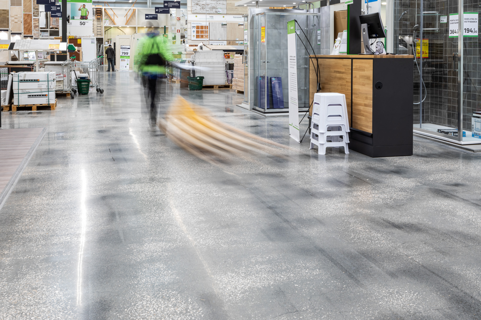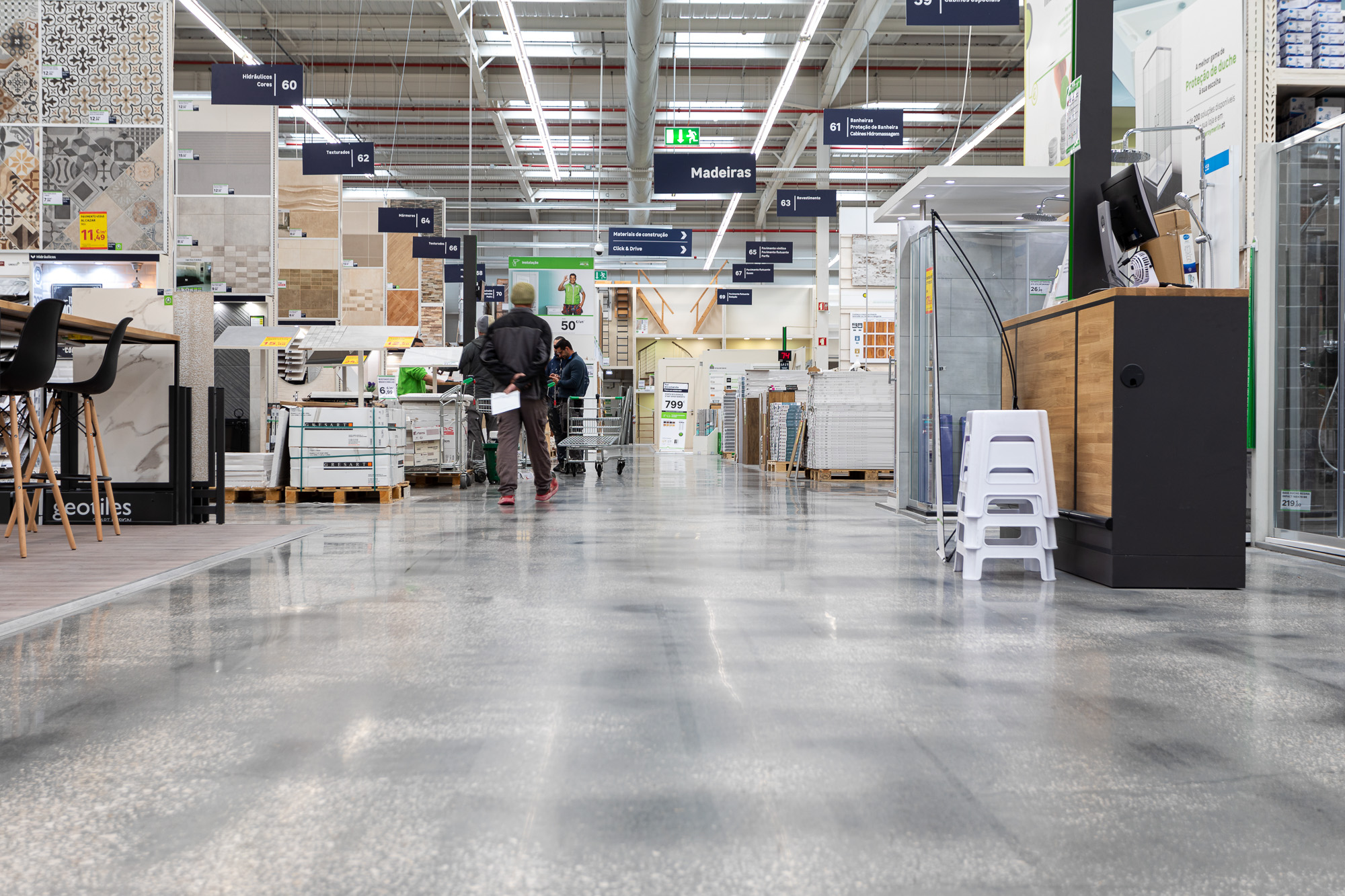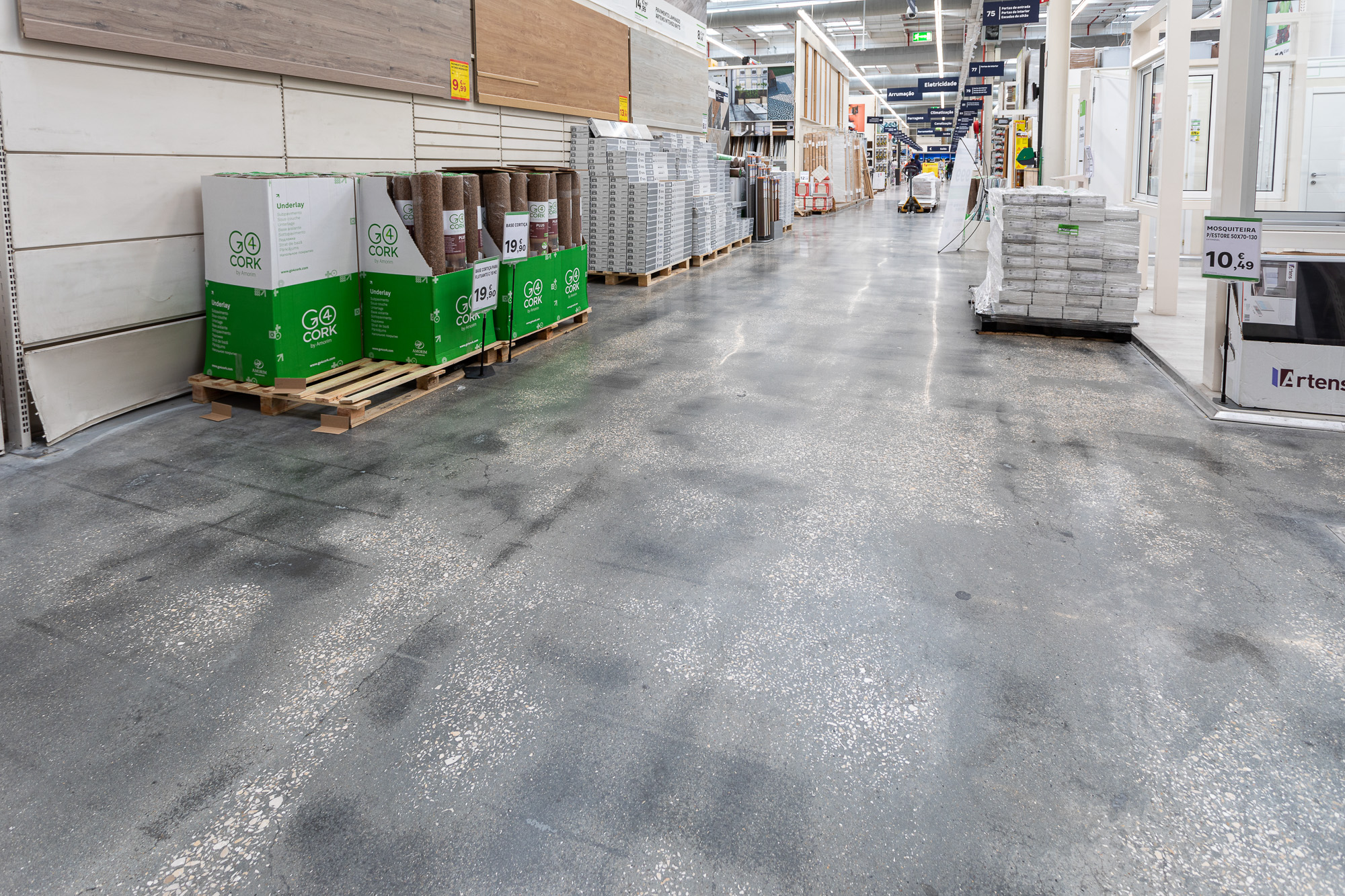 Na obra de renovação da loja da Amadora, a nossa intervenção ocorreu com a loja em funcionamento (horário noturno), onde foi retirado o revestimento de linóleo, desbastados os restos de cola e polido o pavimento de betão. Foi aplicado tratamento com Ashford Formula, polimento até grão 800 e selagem final com RetroGuard.