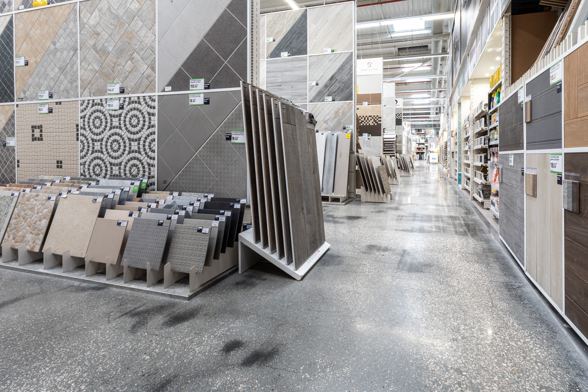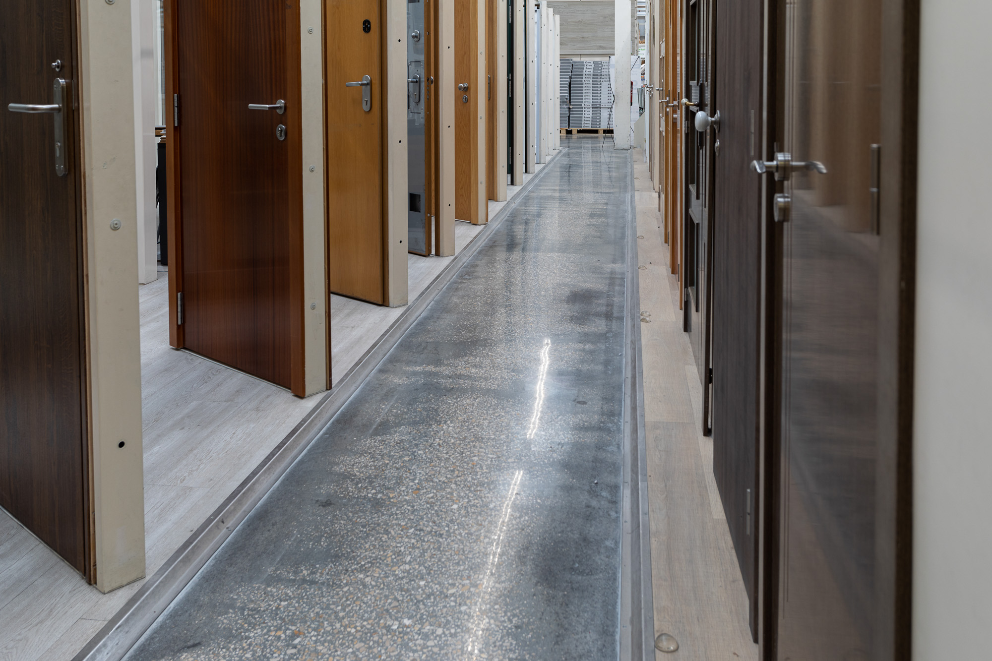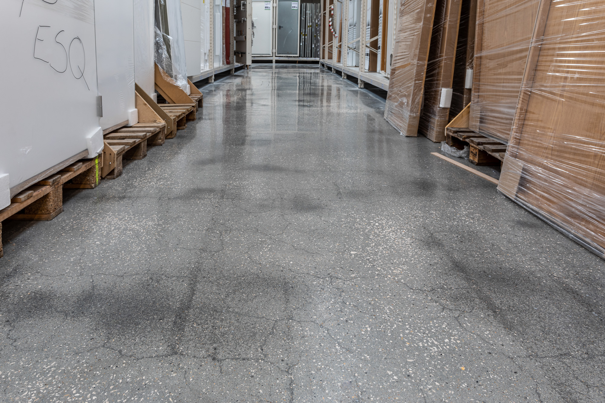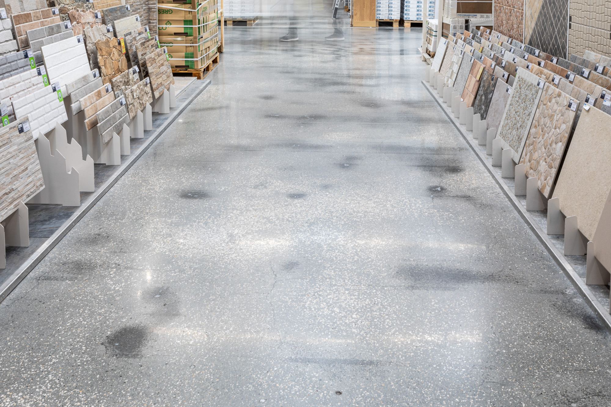 Na obra de renovação da loja da Amadora, a nossa intervenção ocorreu com a loja em funcionamento (horário noturno), onde foi retirado o revestimento de linóleo, desbastados os restos de cola e polido o pavimento de betão. Foi aplicado tratamento com Ashford Formula, polimento até grão 800 e selagem final com RetroGuard.