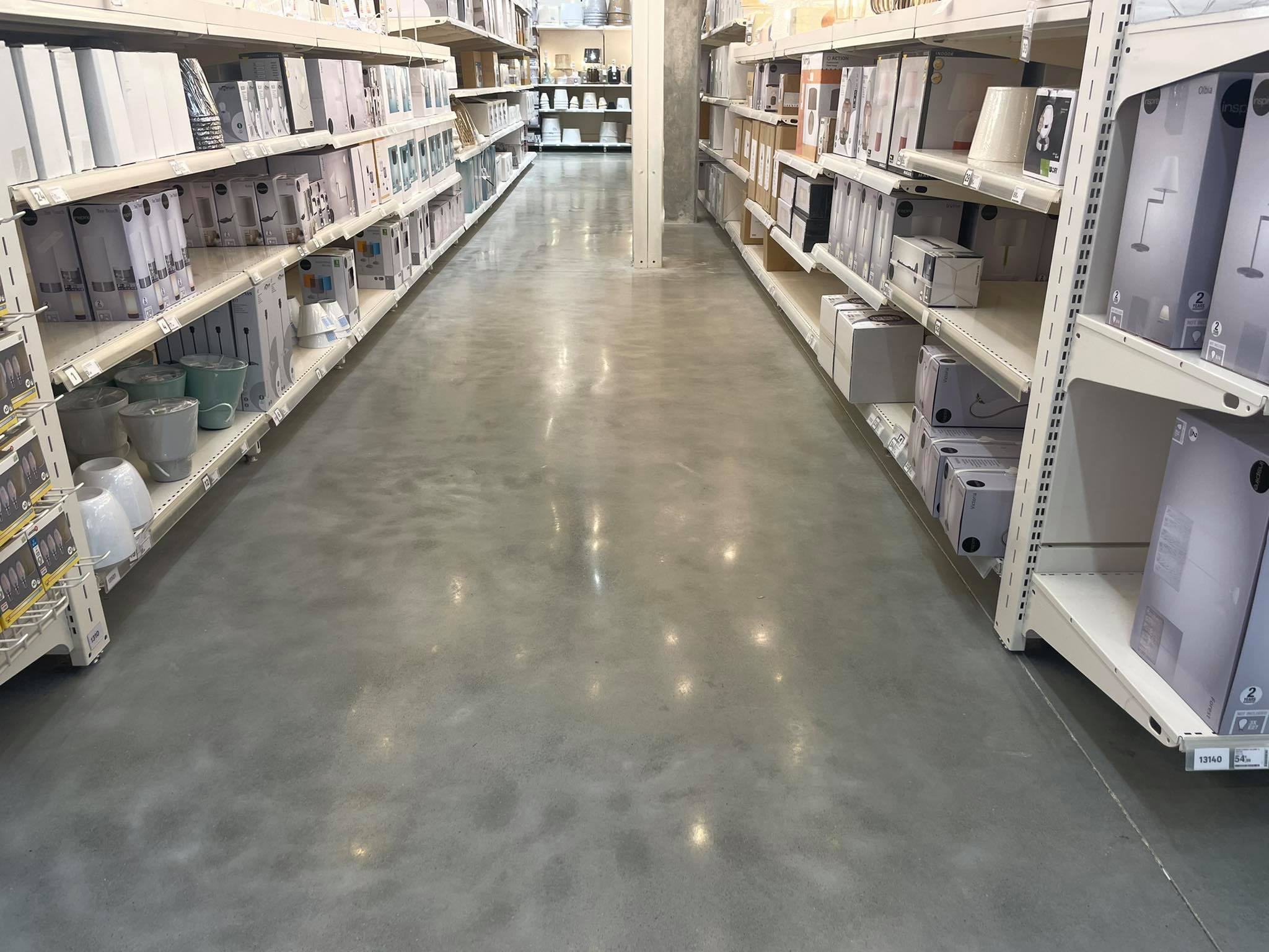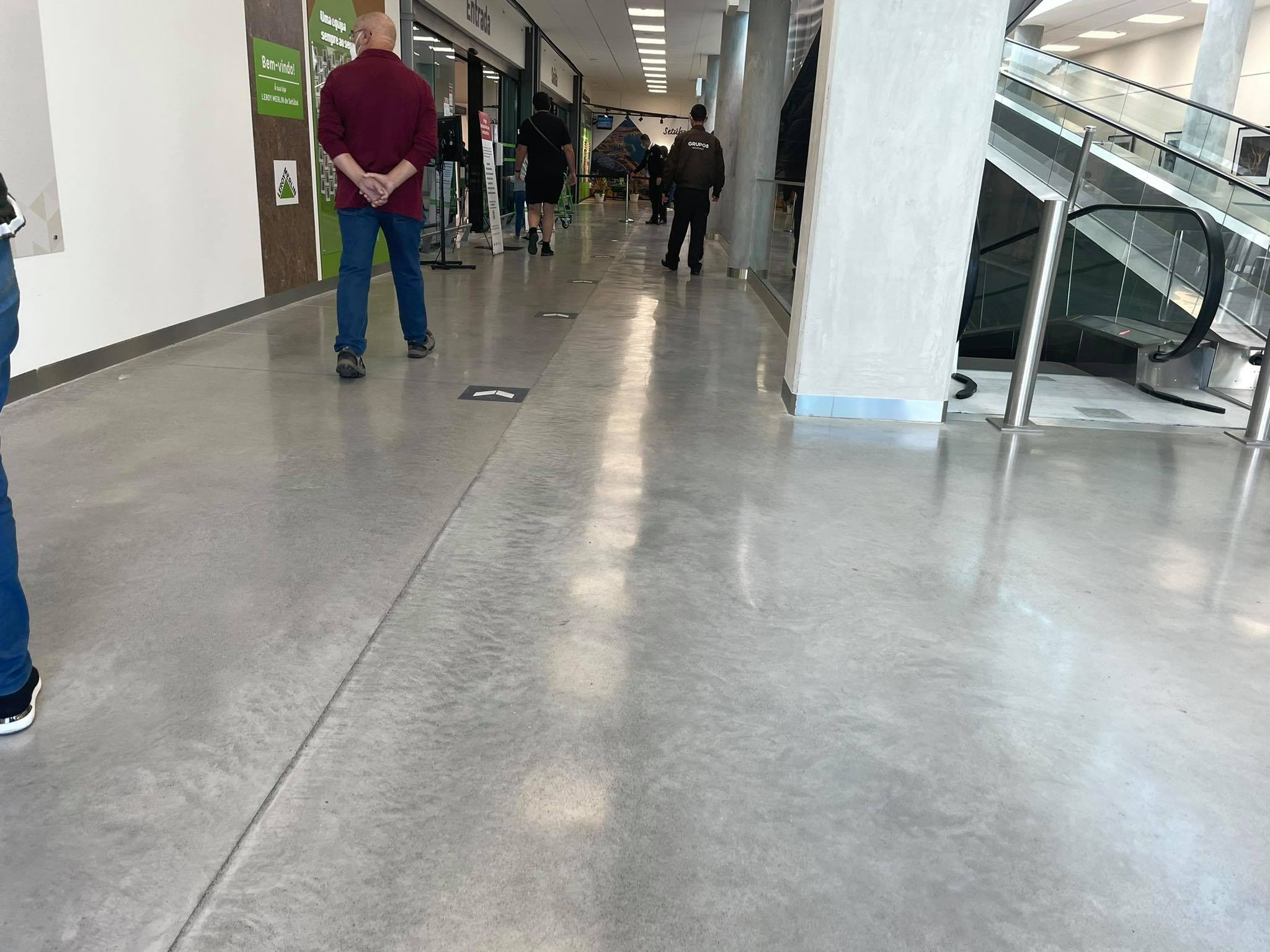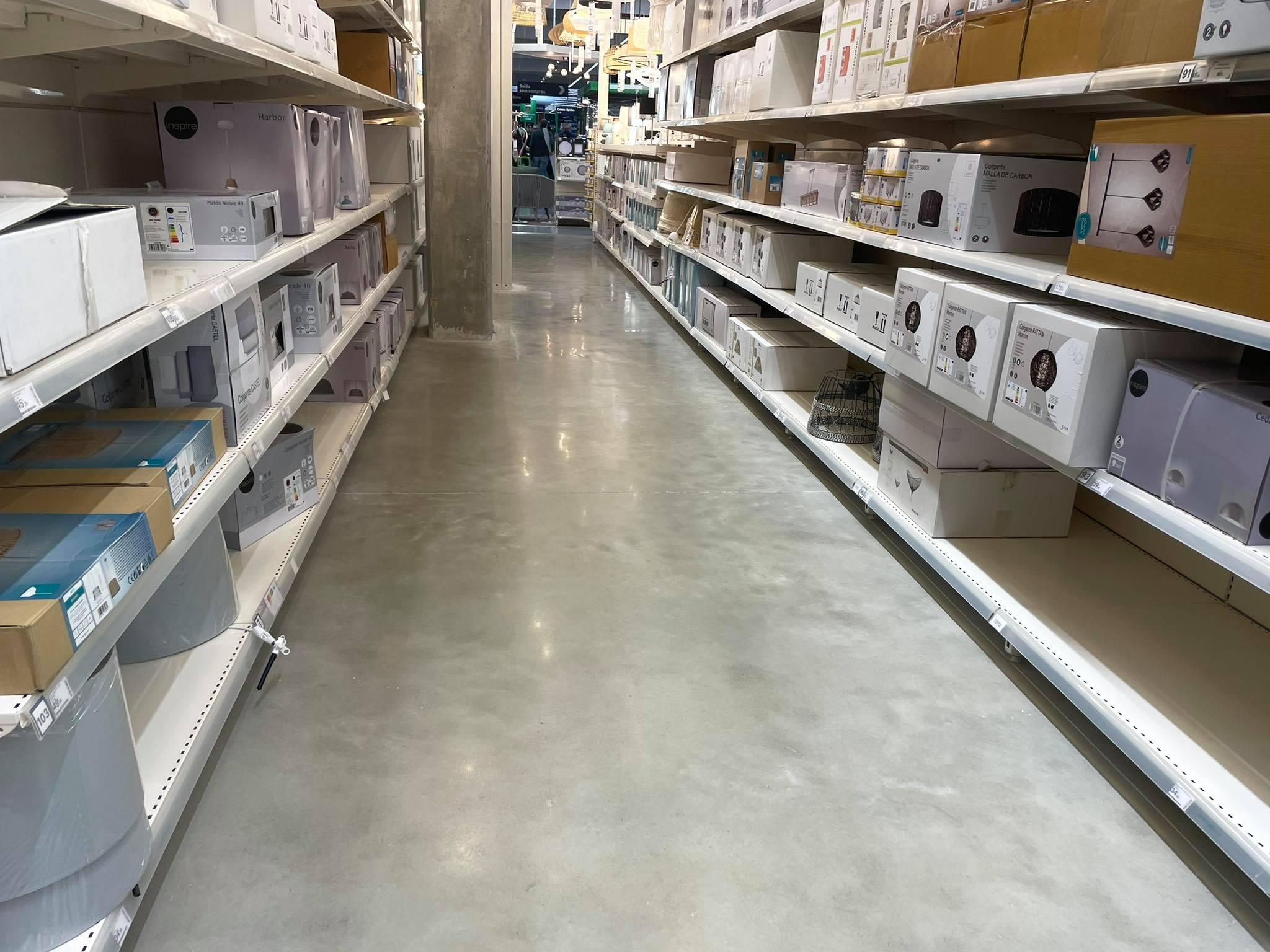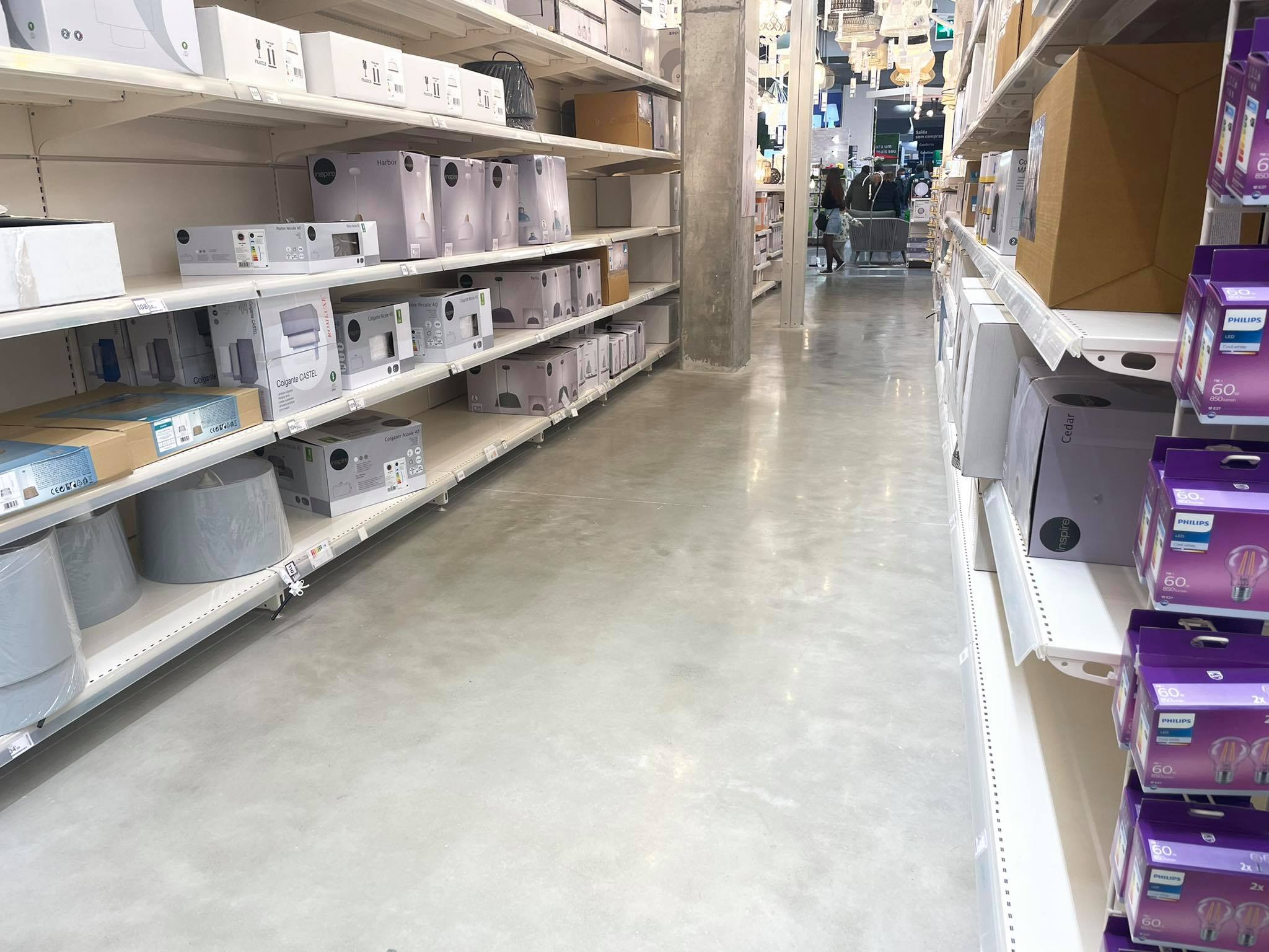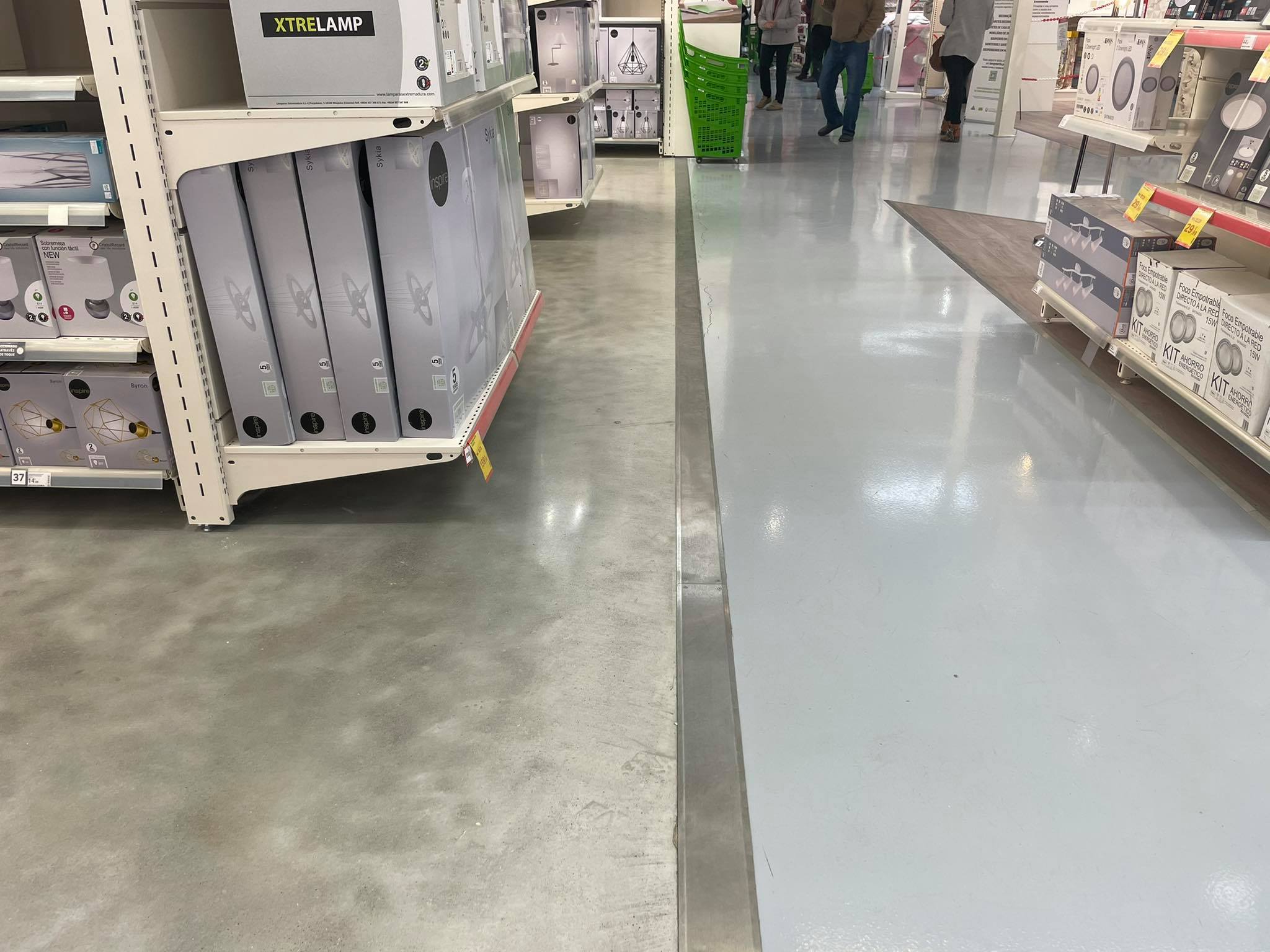 Na obra de renovação da loja de Setúbal, a Belbetão foi convidada a polir as zonas de pavimento novo, em torno das rampas de acesso, munidas de tapetes rolantes. De seguida, o empreiteiro aproveitou a presença da nossa equipa, tendo aumentado a área de intervenção. A loja não foi intervencionada, de forma mais completa, porque o betão inicialmente colocado tinha um pigmento verde, que foi refutado pelo departamento de marketing da empresa. Todas as áreas intervencionadas foram tratadas com Ashford Formula, polidas até grão 1500 e seladas com RetroGuard.