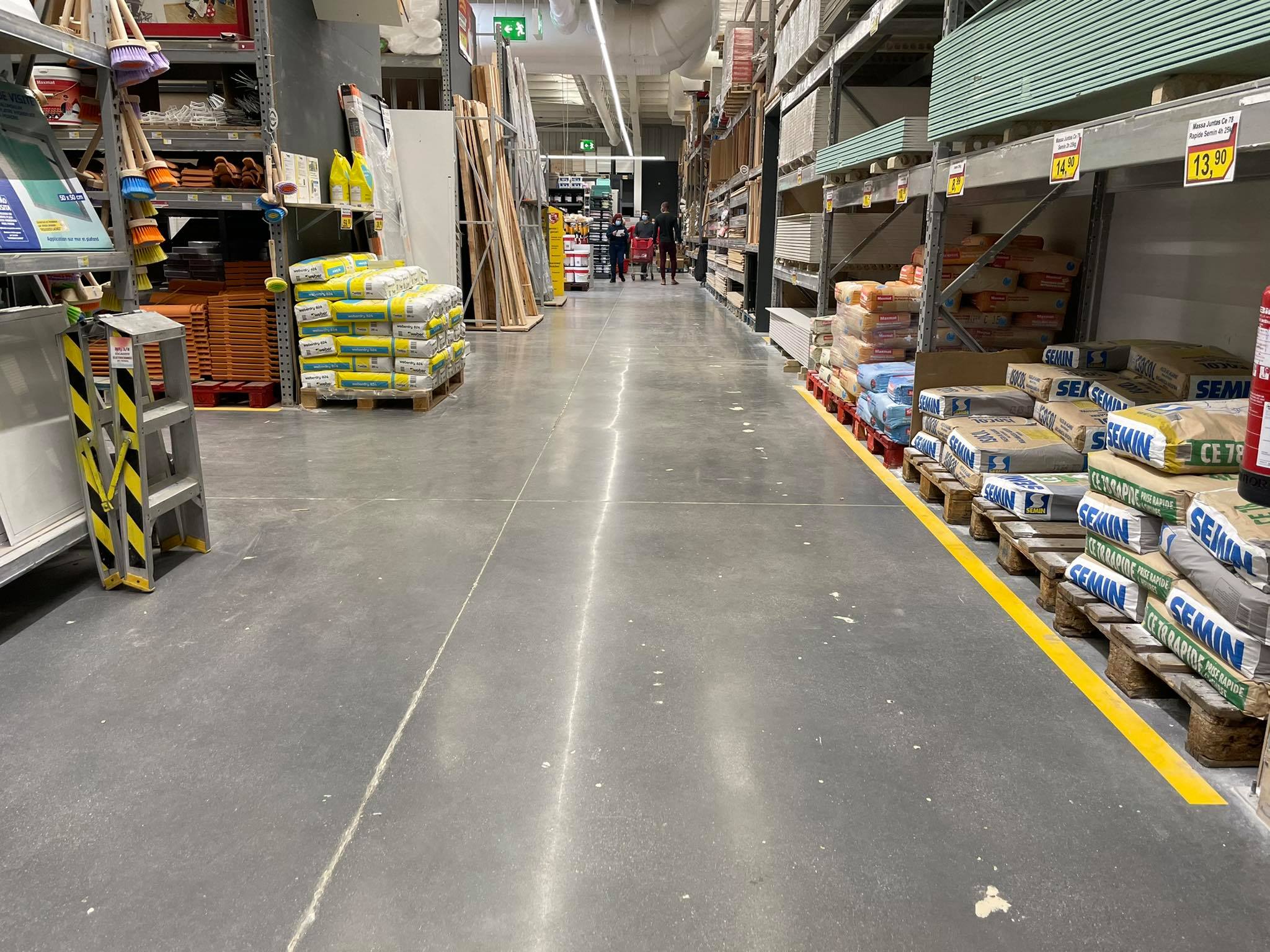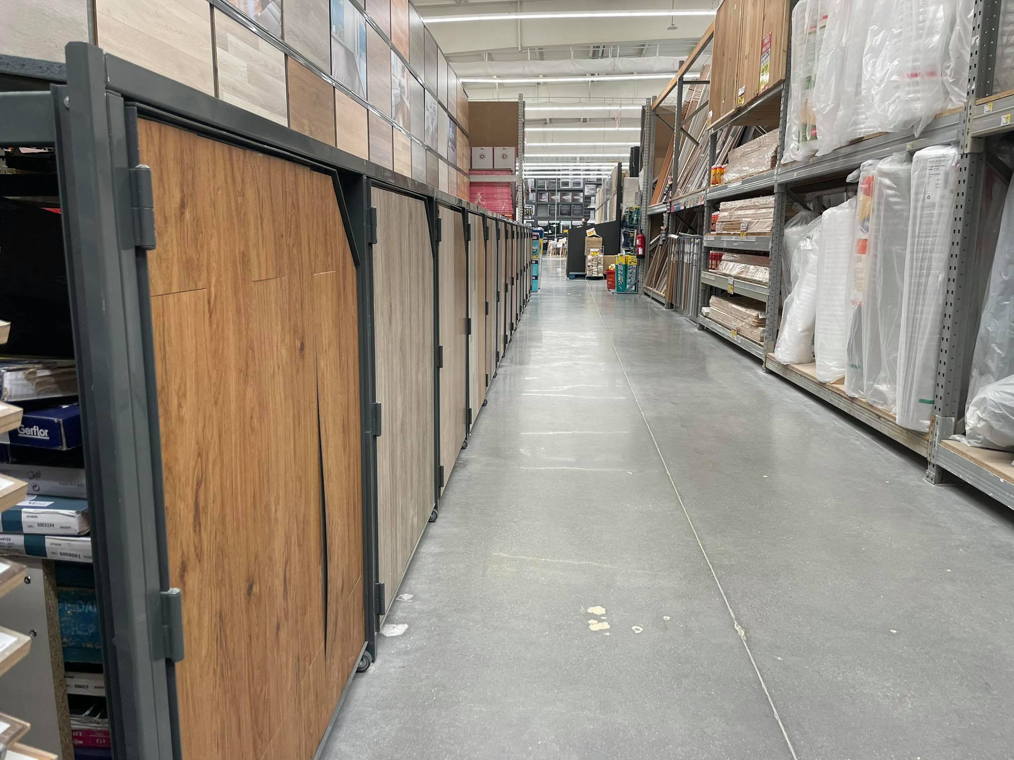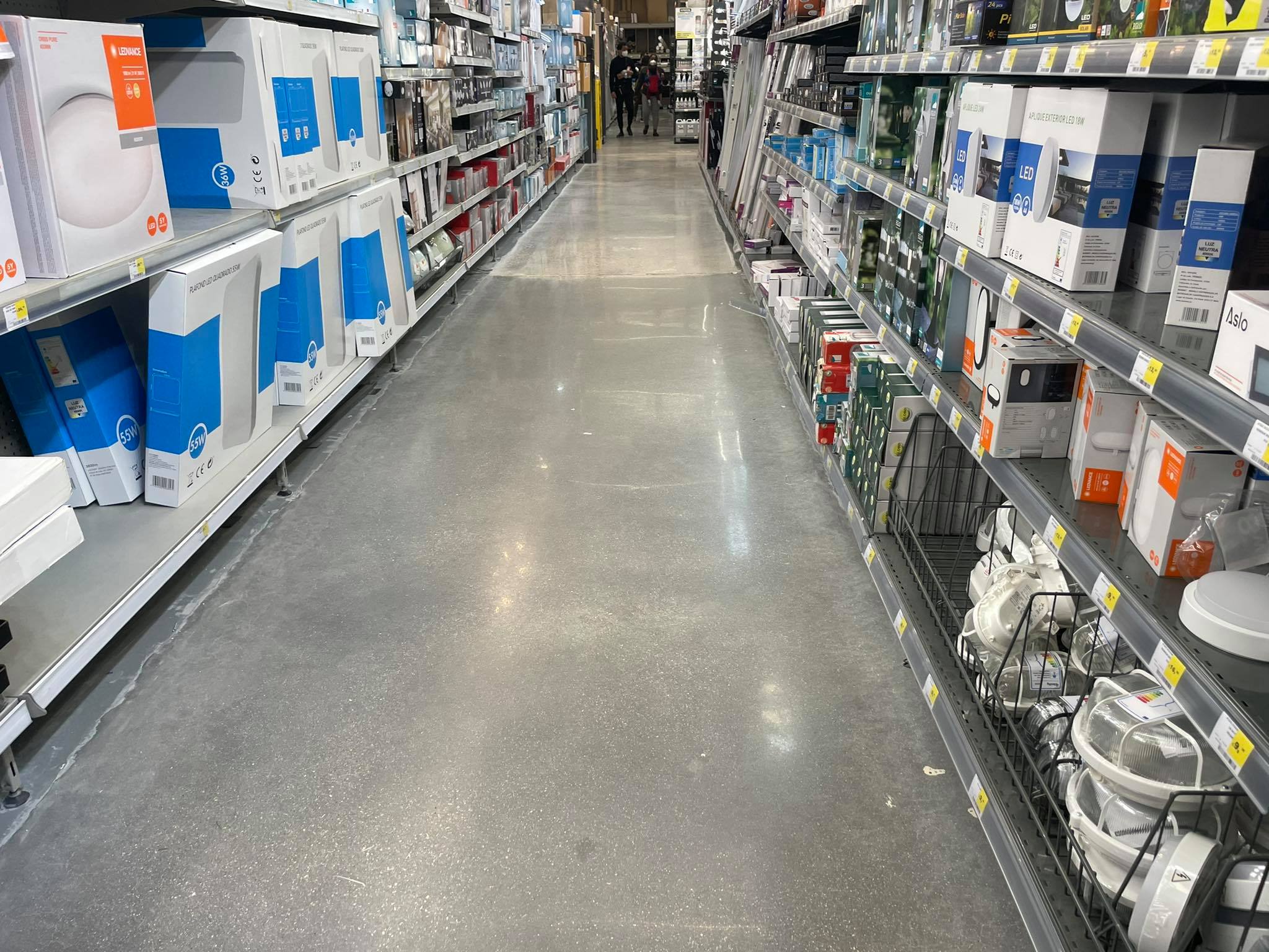 Na loja MaxMat Seixal, com a loja em funcionamento, em horário noturno, removeu-se o revestimento de epóxi com ferramentas metálicas grão 30, continuando com grão 70 e 120. De seguida, o betão foi densificado com RetroPlate e polido até grão 800, antes de ser selado com RetroGuard. Às 9 horas, a loja reabria para o seu normal funcionamento. A média de polimento diário rondou os 130m2.