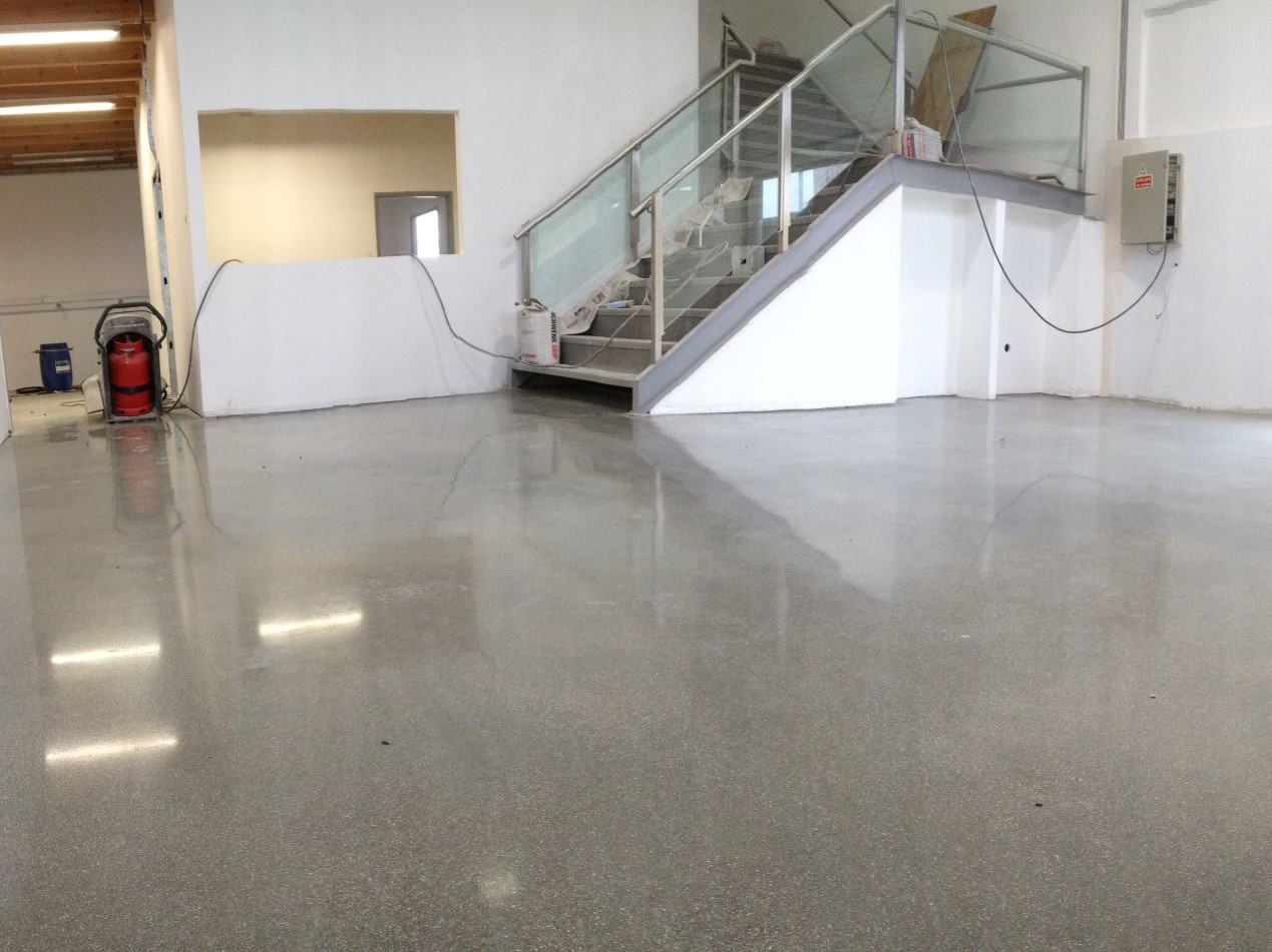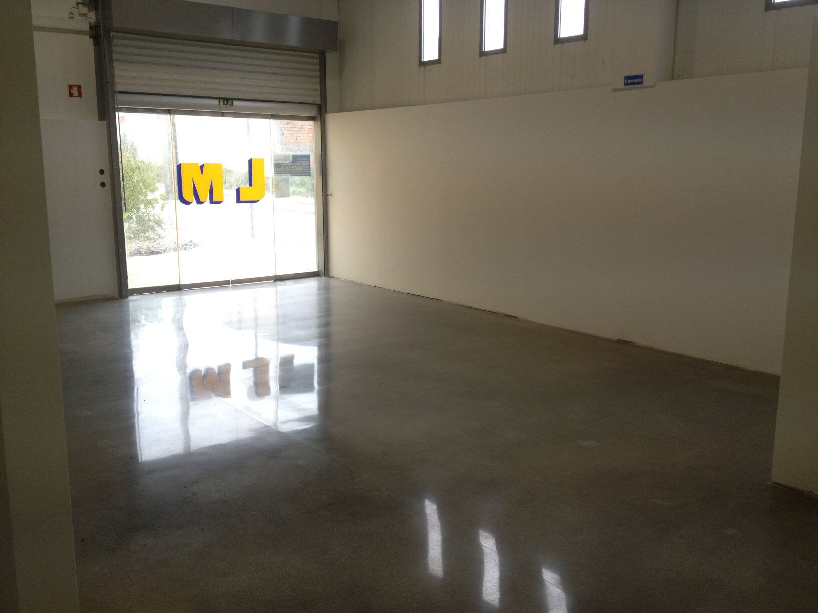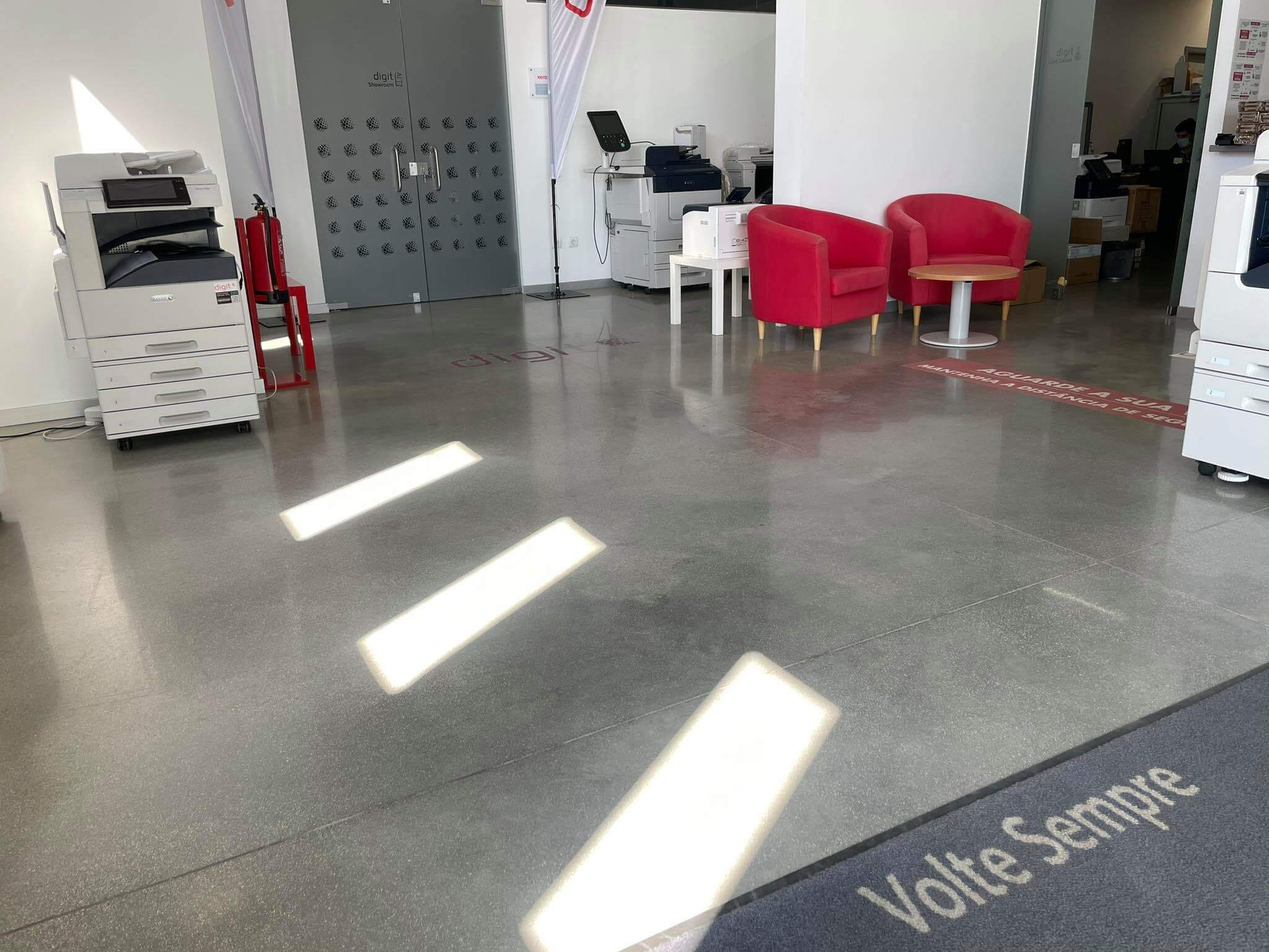 Desbaste e lixagem do pavimento com ferramentas metálicas grão 30, 70 e 120. Densificação com RetroPlate, polimento até grão 1500 e selagem com RetroGuard.